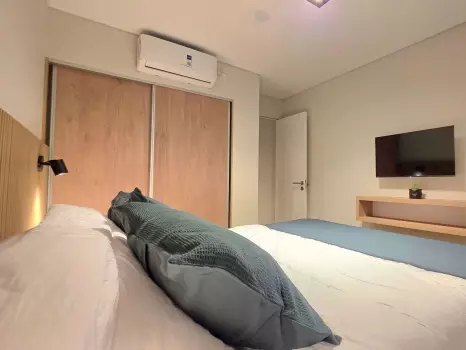El monoambiente cuenta con todo lo necesario para una estadía cómoda: aire acondicionado, conexión WiFi de alta velocidad, Smart TV, cocina equipada, ropa de cama y baño completo. Es un espacio moderno, luminoso y funcional, pensado para disfrutar de una experiencia práctica y confortable.